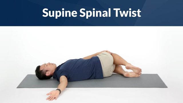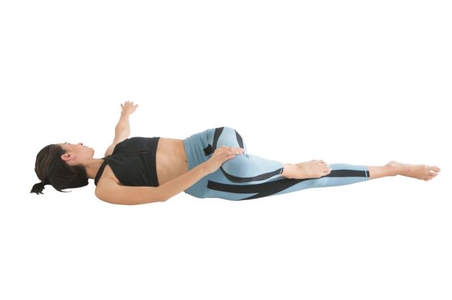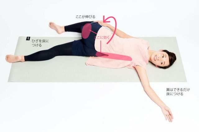 - 仰向けで右膝を立て、左側にゆっくり倒す