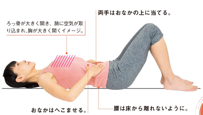 - 吸ってお腹をふくらませ、吐きながら腰を床に沈める